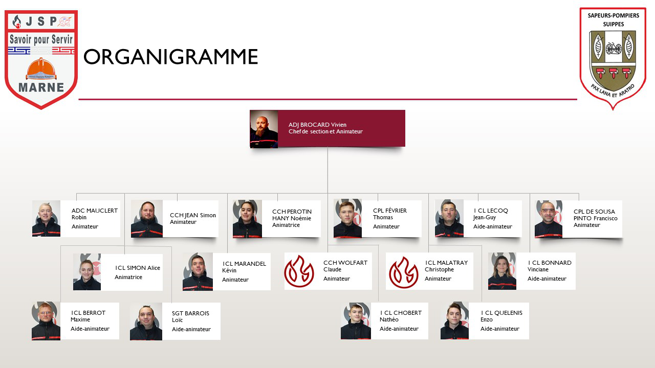 L’équipe pédagogique de la section des jeunes sapeurs-pompiers (JSP) est composée de sapeurs-pompiers professionnels ou volontaires, tous bénévoles, qui se relaient chaque samedi et pour chaque évènements.